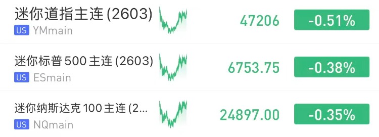 盘前,美股三大期指小幅下跌,纳指期货 $NQmain 跌0.35%,标普500期货 $ESmain 跌0.38%,道指期货 $YMmain 跌0.51%