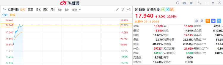 华盛资讯3月13日讯,汇量科技大涨超20%!报17.94港元,成交额8.125亿港元。
