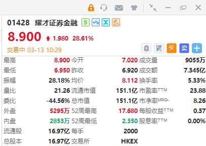 耀才证券金融(01428)今早异动拉升,现大涨超28%,截至发稿,涨28.61%,报8.9港元,成交额7.345亿港元。