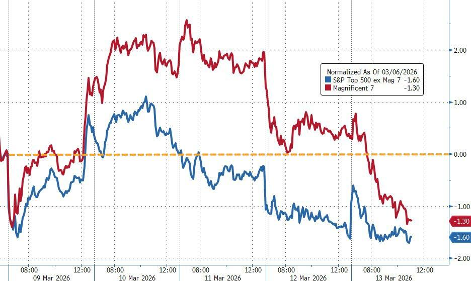 (科技七巨头指数与标普剩余493只成分股本周走势图)