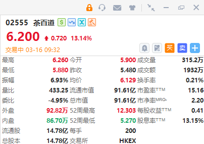 茶百道(02555)盈喜后高开逾13%,截至发稿,涨13.14%,报6.2港元,成交额1932万港元。