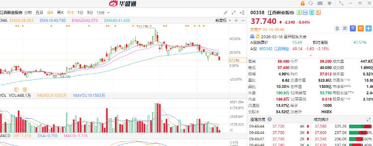 智通财经APP获悉,铜业股跌幅居前,截至发稿,江西铜业股份(00358)跌6.34%,报37.54港元;中国黄金国际(02099)跌5.06%,报159.5港元;中国有色矿业(01258)跌4.38%,报4.45%,报12.23港元。