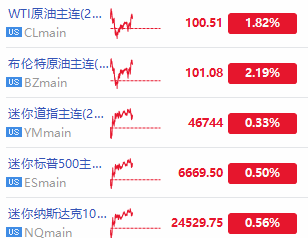 华盛资讯3月16日讯,美股三大期指普涨,纳指期货 $NQmain 涨0.56%,道指期货 $YMmain 涨0.33%,标普500指数期货 $ESmain 涨0.5%;原油期货均涨约2%。