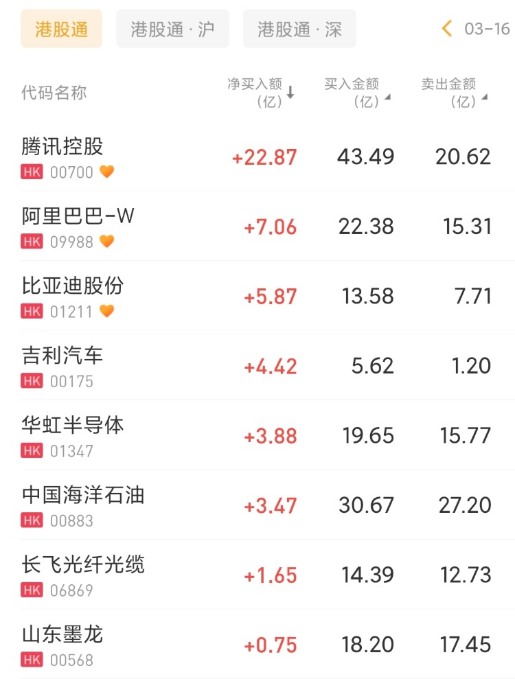 腾讯控股、阿里巴巴-W、比亚迪股份分别获净买入22.87亿港元、7.06亿港元、5.87亿港元;