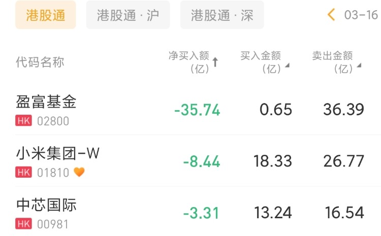 盈富基金、小米集团-W、中芯国际分别遭净卖出35.74亿港元、8.44亿港元、3.31亿港元。