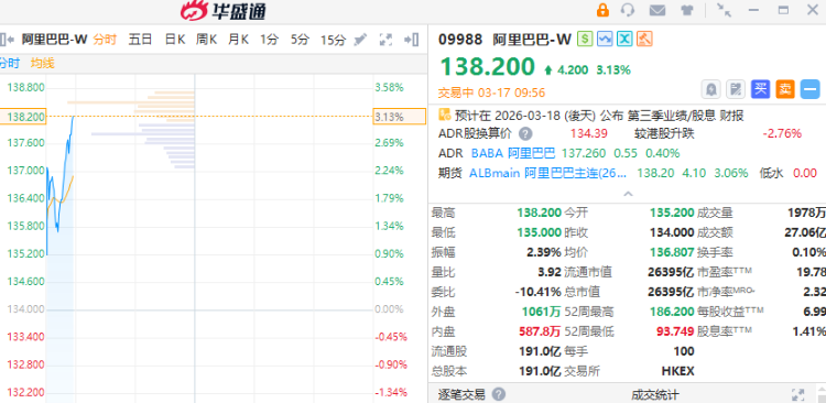 3月17日讯,港股阿里巴巴早盘高开高走大涨逾3%,当前成交额超27亿港元。