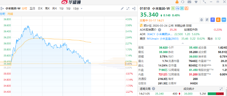 小米集团-W(1810)连升三日,今早升3%重上50天线。公司将于周四(19日)晚举办春季新品发布会,将推出新一代小米SU7电车。留意小米将于下周二(24日)公布业绩,可留意: