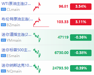 华盛资讯3月17日讯,美股三大期指普跌,纳指期货 $NQmain 跌0.39%,道指期货 $YMmain 跌0.36%,标普500指数期货 $ESmain 跌0.38%;原油期货 $CLmain 、 $BZmain 均涨超3%。