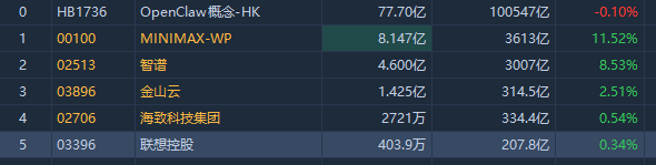 Openclaw概念股再起升势,截至发稿,MINIMAX-W涨超11%,智谱涨超8%,金山云涨超2%,海致科技集团涨超0.5%。