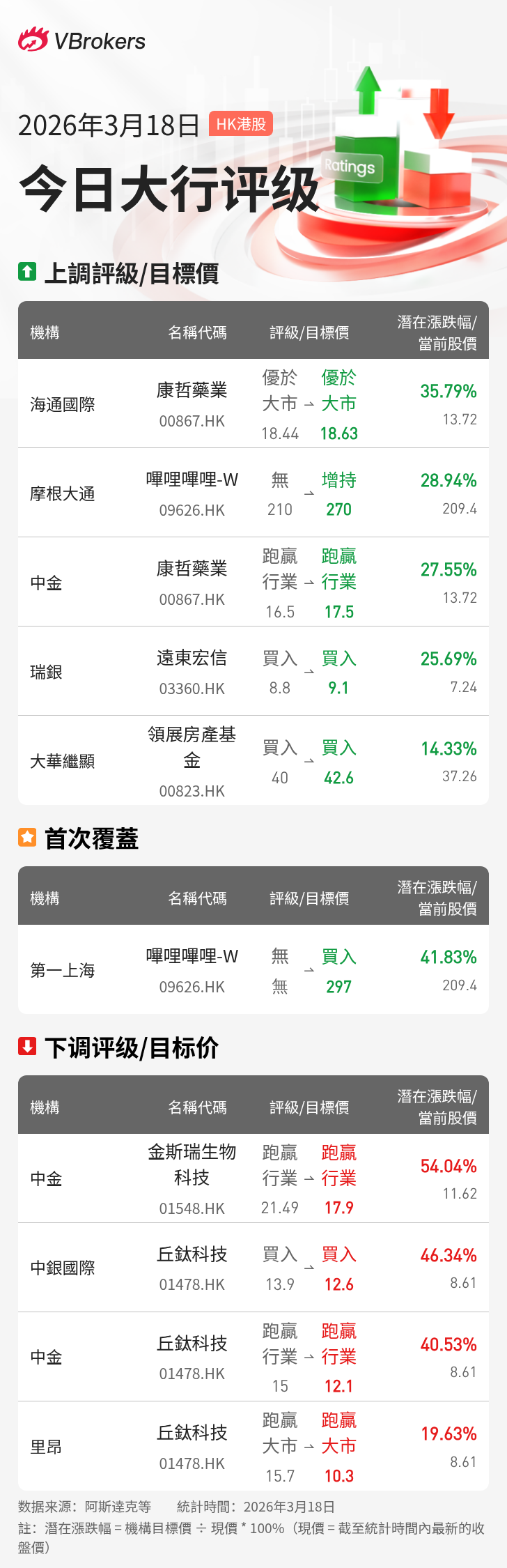 | 海通國際 | 康哲药业 | 00867.HK | 上调 | $18.63 | $13.72 | 35.79% |