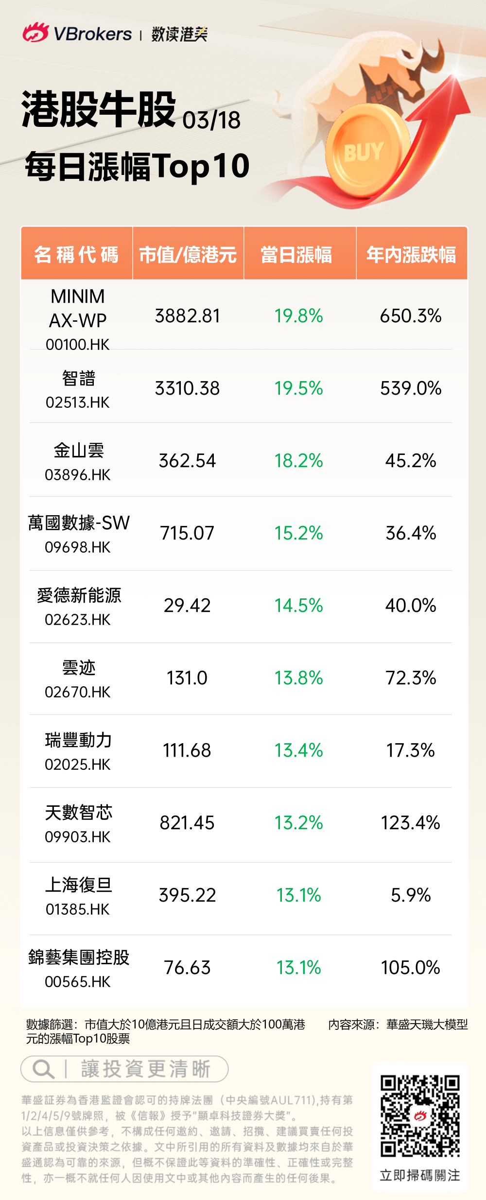 發仔统计了每日港股涨幅Top10,具体名单如下: