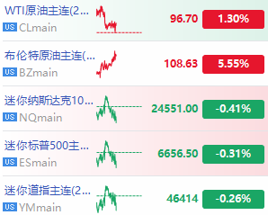 华盛资讯3月19日讯,美股三大期指普跌,纳指期货 $NQmain 跌0.41%,标普500指数期货 $ESmain 跌0.31%,道指期货 $YMmain 跌0.26%;美油期货 $CLmain 涨超1%,布油期货 $BZmain 涨超5%。