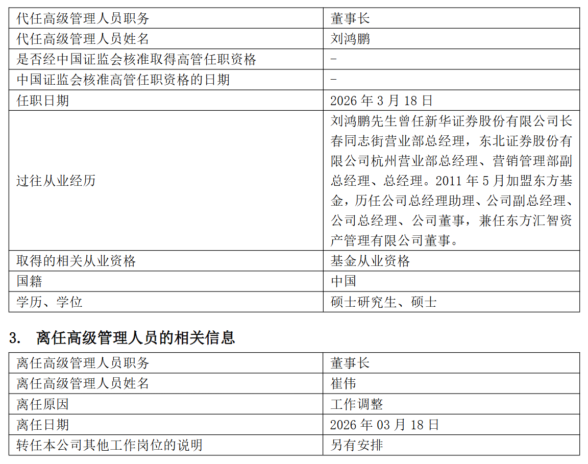 3月20日,东方基金发布高管变更公告称,3月18日,因工作调整原因,崔伟离任董事长职务,由总经理刘鸿鹏代任董事长。