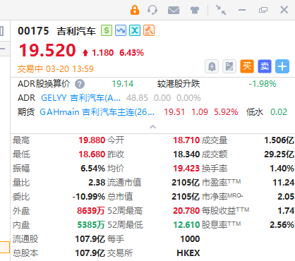 吉利汽车股价逆市走高,截至发稿,报19.52港元,涨6.43%,股价创年内新高,成交额29.25亿港元。