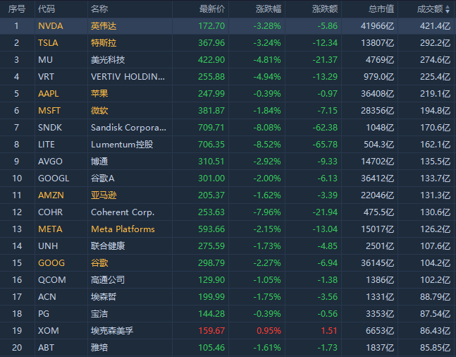 第4名VRT收跌4.94%,成交193.59亿美元。