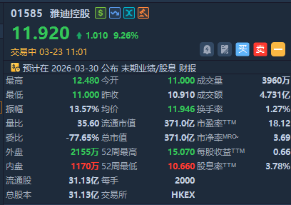 雅迪控股早盘一度涨超13%,截至发稿,涨超9%,报11.92港元,成交额超4.7亿港元。