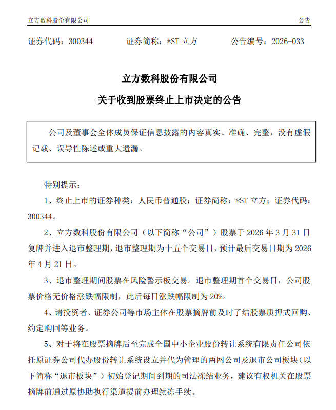 3月23日,*ST立方(300344.SZ)公告称,公司于2026年3月23日收到深交所《关于立方数科股份有限公司股票终止上市的决定》,深圳证券交易所决定终止公司股票上市交易。公司股票自2026年3月31日起复牌并进入退市整理期,预计最后交易日为2026年4月21日。