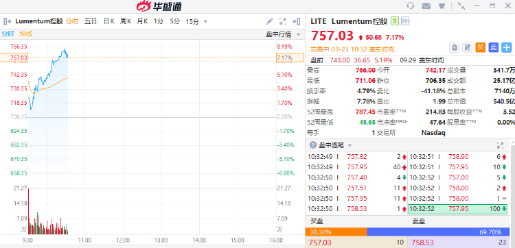 华盛资讯3月23日讯,美股光通信概念股再起升势!康宁、Lumentum控股涨超7%, $CRDO 、应用光电涨超6%, $COHR 涨近5%。