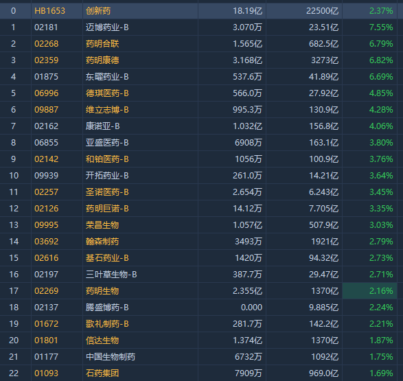 华盛资讯3月24日讯,创新药概念集体拉升,“药明系”涨幅居前,药明合联、药明康德涨超6%,康诺亚-B涨超4%,荣昌生物涨超3%,药明生物涨超2%,信达生物涨超1%。
