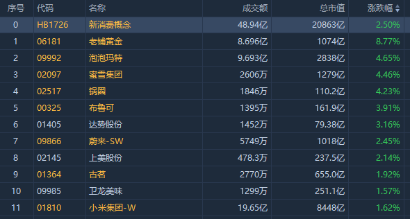 泡泡玛特、蜜雪集团涨超4%,锅圈涨超4%,布鲁可涨超3%,古茗涨近2%。消息面上,泡泡玛特、蜜雪集团、古茗等多家新消费公司本周公布业绩