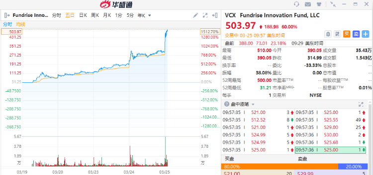 截至发稿,上周四登陆美国纽约证券交易所的Fundrise创新基金( $VCX )再飙升60%,最新报价达503.97美元,上市以来已经狂涨近1600%!