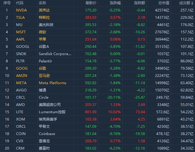 第3名美光收跌2.18%,成交173.04亿美元。