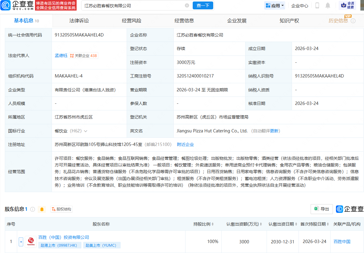 企查查APP显示,近日,江苏必胜客餐饮有限公司成立,法定代表人为孟德钰,注册资本为3000万元,经营范围包含:餐饮服务;食品销售;食品互联网销售;食品经营管理;餐厨垃圾处理;出版物批发等。企查查股权穿透显示,该公司由百胜(中国)投资有限公司全资持股。