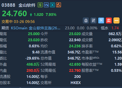 金山软件绩后涨近8%,报24.76港元,成交额2.09亿港元。