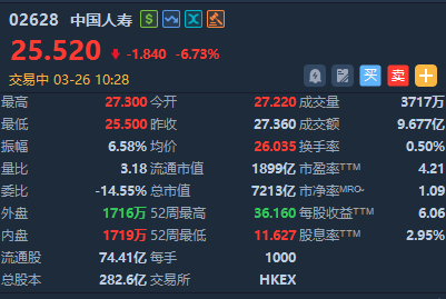中国人寿绩后跌超6%,截至发稿,报25.52港元,成交额9.7亿港元。
