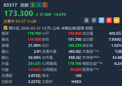 迅策股价持续走强,涨超14%,成交额超7.9亿元。