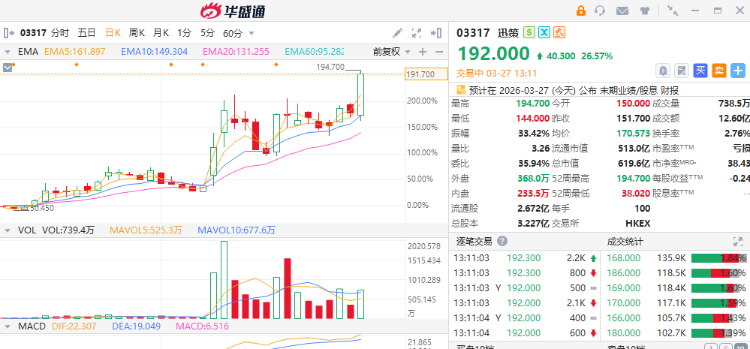 迅策(03317)大涨超26%,高见194港元创上市以来新高,上市累计涨幅超300%,截至发稿,报192港元,成交额12.6亿港元。