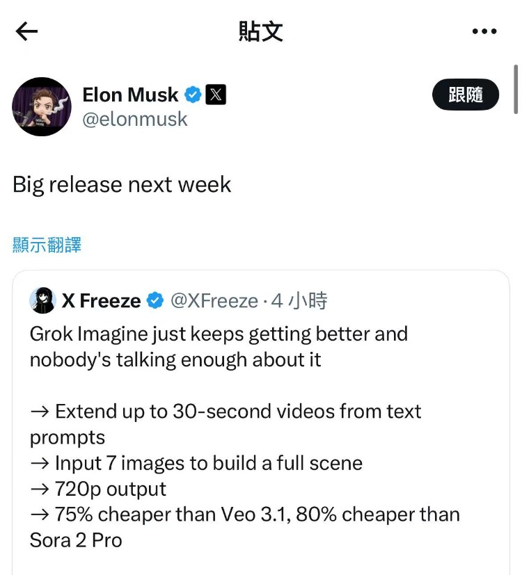 马斯克在社交平台X上表示,Grok Imagine下周将有重大发布。
