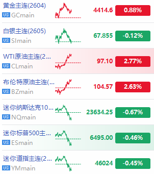 美股三大期指齐走低,纳指期货跌超0.6%;原油期货重拾升势,均涨超2%;COMEX期货黄金涨幅收窄至约0.9%,COMEX期货白银转跌。