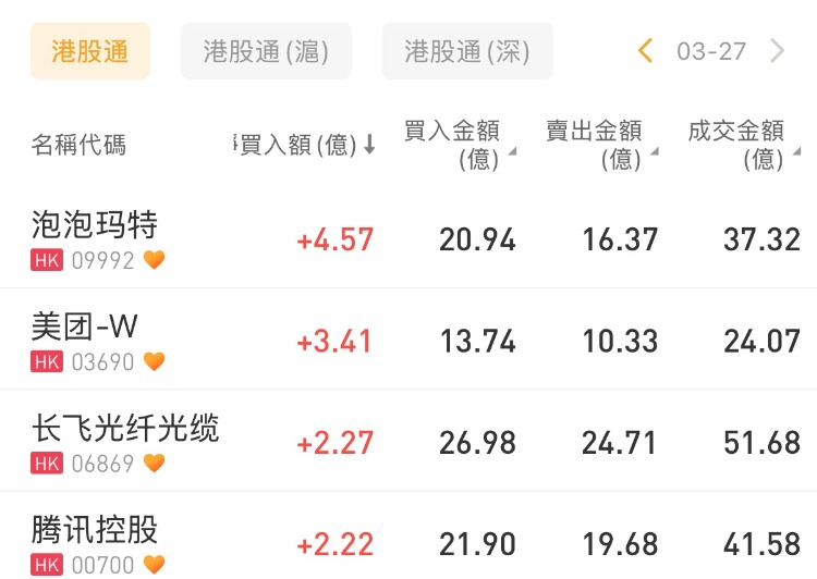 泡泡玛特、美团-W、长飞光纤光缆分别获净买入4.57亿港元、3.41亿港元、2.27亿港元;