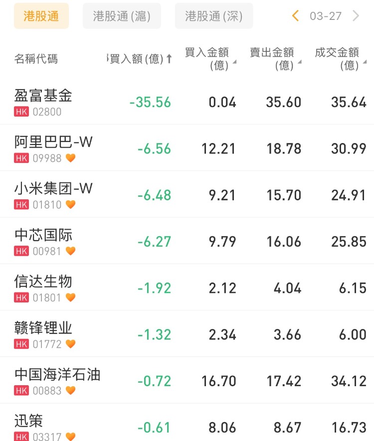 盈富基金、阿里巴巴-W、小米集团-W分别遭净卖出35.56亿港元、6.56亿港元、6.48亿港元。