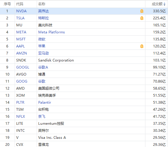第9名博通收跌2.82%,成交70.78亿美元。据报道,博通一位高管表示,其制造合作伙伴台积电的产能已接近极限,在人工智能芯片需求激增的情况下,整个行业正面临更广泛的供应链制约。“我们看到台积电的产能已经达到极限,”博通物理层产品部门产品营销总监Natarajan Ramachandran告诉记者。“他们将在2027年之前提高产能,但这已经成为瓶颈,或者说在2026年已经阻碍了供应链,”他补充道。