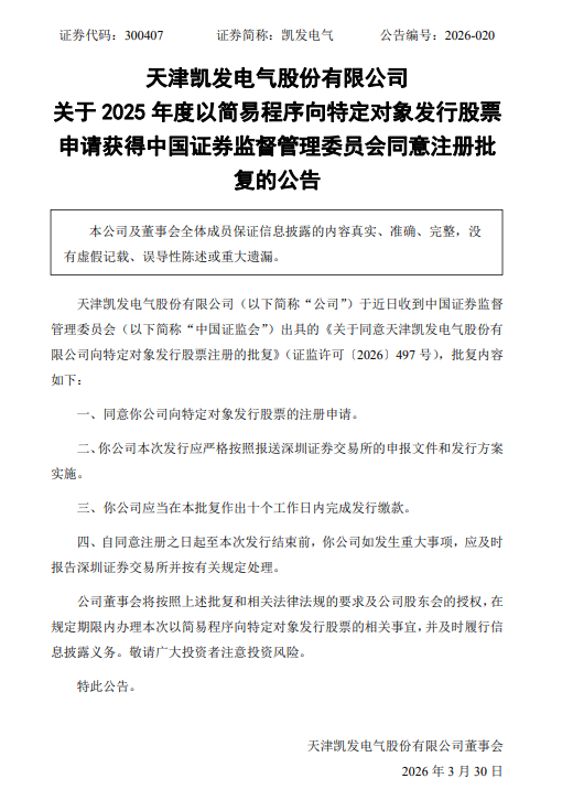 3月30日,凯发电气(300407.SZ)早间公告,公司于近日收到中国证监会出具的《关于同意天津凯发电气股份有限公司向特定对象发行股票注册的批复》,同意公司向特定对象发行股票的注册申请。