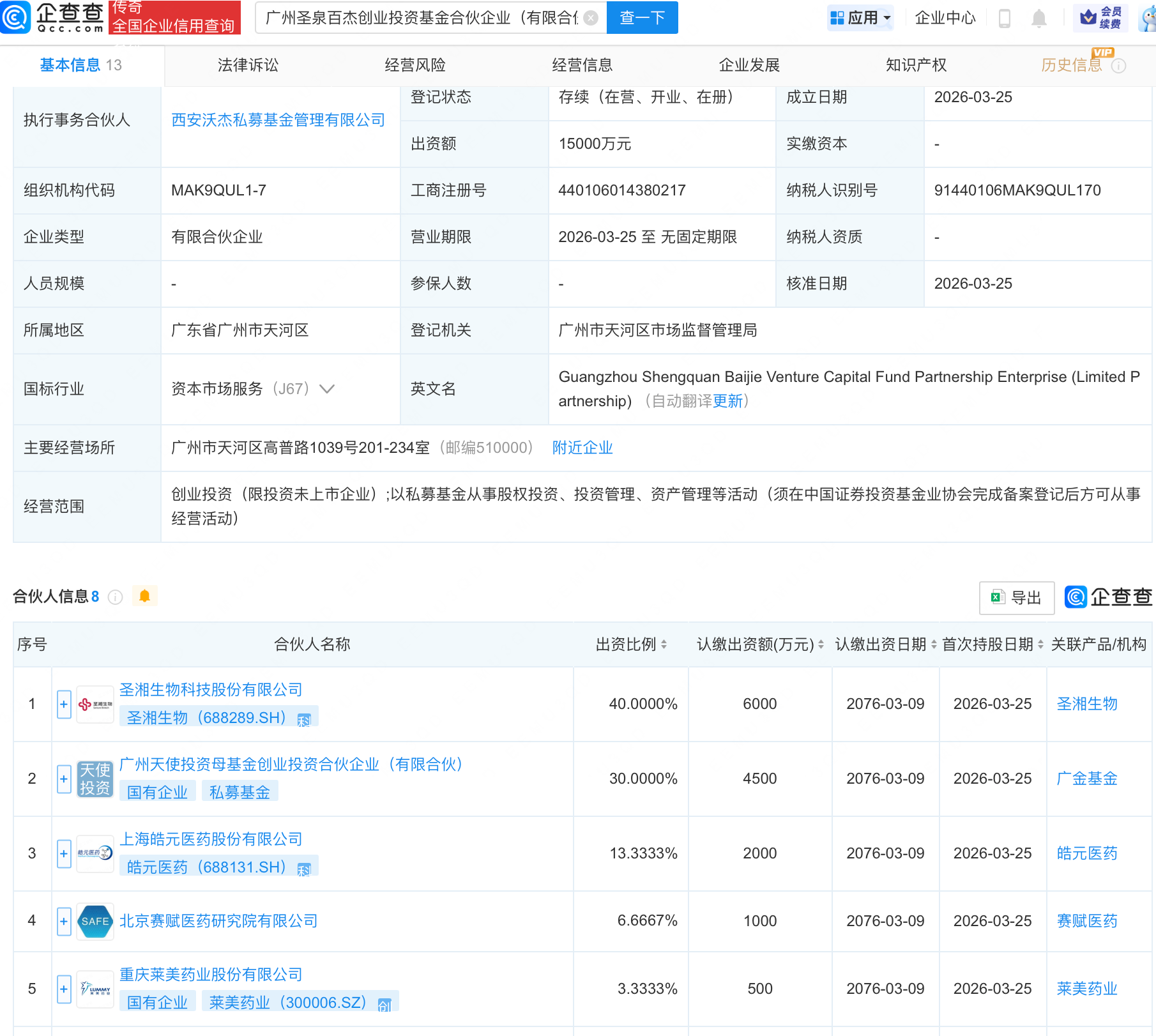 企查查APP显示,近日,广州圣泉百杰创业投资基金合伙企业(有限合伙)成立,出资额1.5亿元,经营范围包含:创业投资(限投资未上市企业);以私募基金从事股权投资、投资管理、资产管理等活动。企查查股权穿透显示,该企业由圣湘生物(688289.SH)、皓元医药(688131.SH)、莱美药业(300006.SZ)等共同出资。
