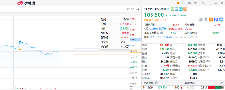 比亚迪( $01211.HK )去年少赚19%至326亿人民币,收入按年升3%至8,039亿人民币,两者同样低于市场预期,股价早段反复,曾经跌5%,低见101.1元后一度倒升。
