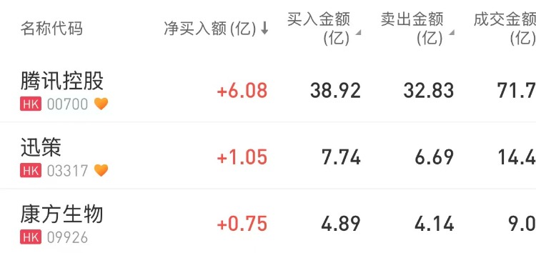 腾讯控股、迅策、康方生物分别获净买入6.08亿港元、1.05亿港元、0.75亿港元;