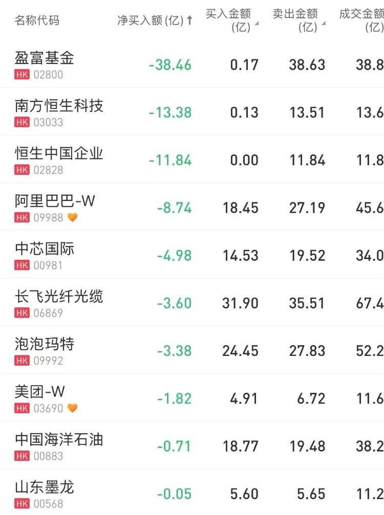 盈富基金、南方恒生科技、恒生中国企业分别遭净卖出38.46亿港元、13.38亿港元、11.84亿港元。