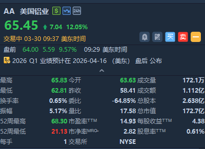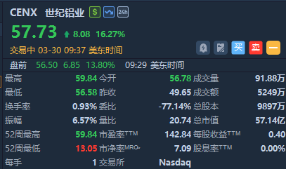 华盛资讯3月30日讯,铝业股涨幅居前,世纪铝业大涨超16%、美国铝业涨超12%。