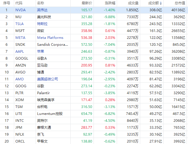 周一美股成交额第1名英伟达收跌1.40%,成交308亿美元。英伟达今日收于165.17美元,较2025年10月29日收盘价207.02美元已下跌20.2%,标志着该股进入熊市区域。