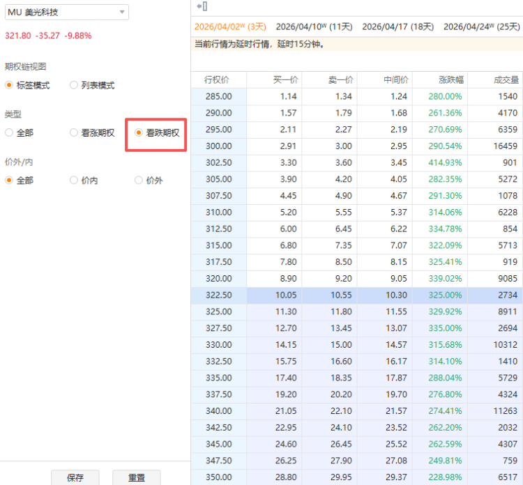 其中一看跌期权(MU_260402_P_300.0)交易量达1.65万张,该合约行权价为300.0美元,行权日在2026-04-02,该张期权涨290.54%。此外,多张Put单涨超300%。