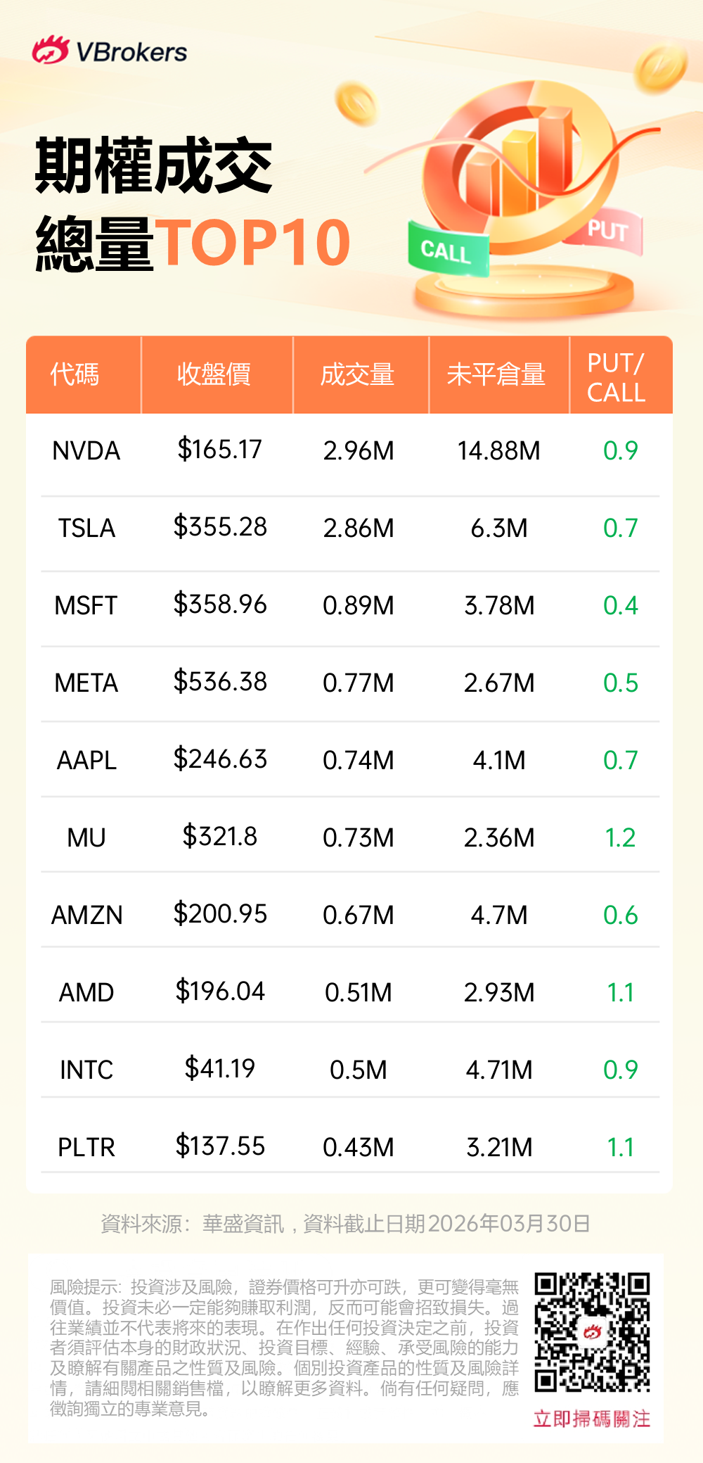 隔夜个股期权成交量前十位分别为:英伟达、特斯拉、微软、Meta Platforms、苹果、美光科技、亚马逊、美国超微公司、英特尔、Palantir。