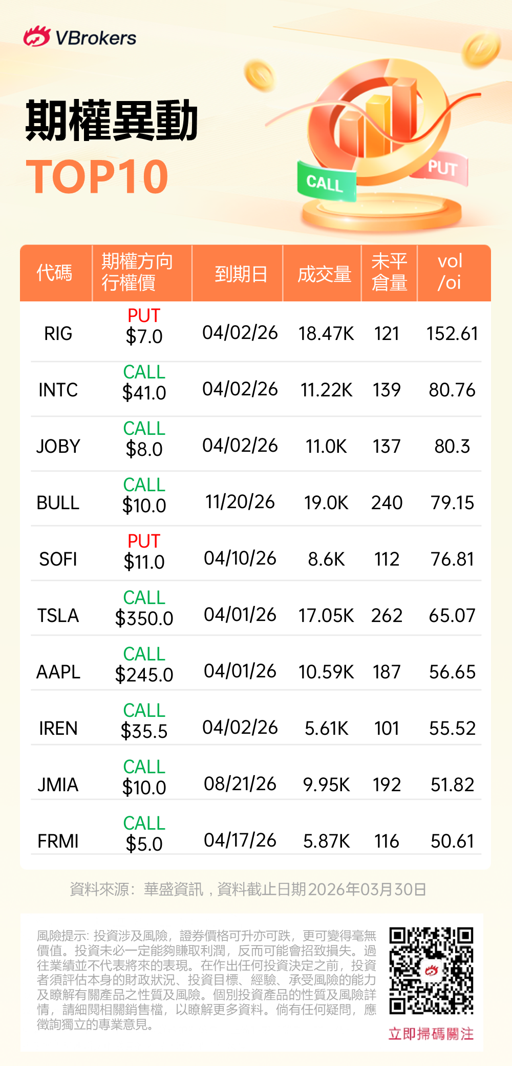 其中一看跌期权(INTC_260402_P_40.0)交易量达1.77万张,该合约行权价为40.0美元,行权日在2026-04-02,该张期权涨72.97%。
