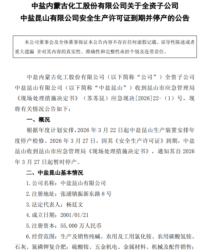 3月31日,中盐化工(600328.SH)公告称,全资子公司中盐昆山有限公司因《安全生产许可证》到期及年度检修安排,收到昆山市应急管理局通知,自3月27日起暂时停产。中盐昆山主营纯碱、氯化铵,目前处于亏损状态,本次停产对公司经营数据的具体影响以后续经审计的财务报告为准。