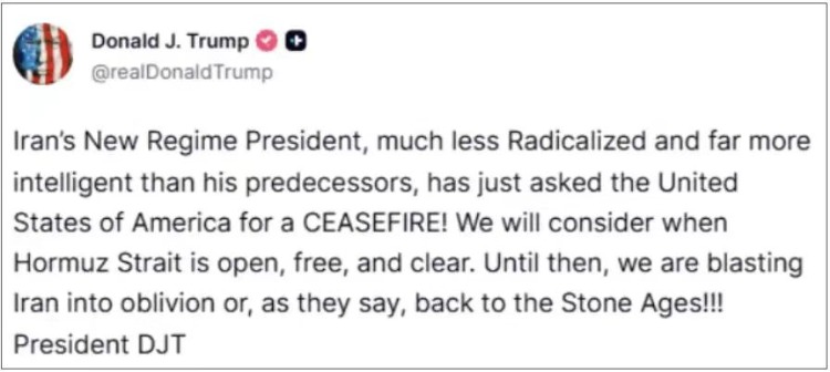 据CCTV国际时讯报道,美国总统特朗普4月1日在社交媒体发帖宣称,“伊朗新政权总统比他的前任们理性得多,也没那么极端,刚刚向美国请求停火!而我们要等到霍尔木兹海峡重新开放、畅通无阻时才会考虑。在那之前,我们会把伊朗炸成废墟,或者用他们的话说,炸回石器时代。”特朗普没有解释这个所谓的“伊朗新政权总统”究竟是谁。伊朗方面暂无回应。