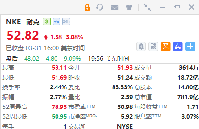 耐克(NKE.US)股价在盘后交易中扩大跌幅,此前该公司预计本季度营收将出现令人意外的下滑,这加剧了投资者对伊朗战争将损害其复苏努力的担忧。财报显示,耐克截至 2 月 28 日的第三季度营收为 113 亿美元,超过平均预期,但与去年同期持平;每股收益为0.35美元,高于预期的 0.28 美元。