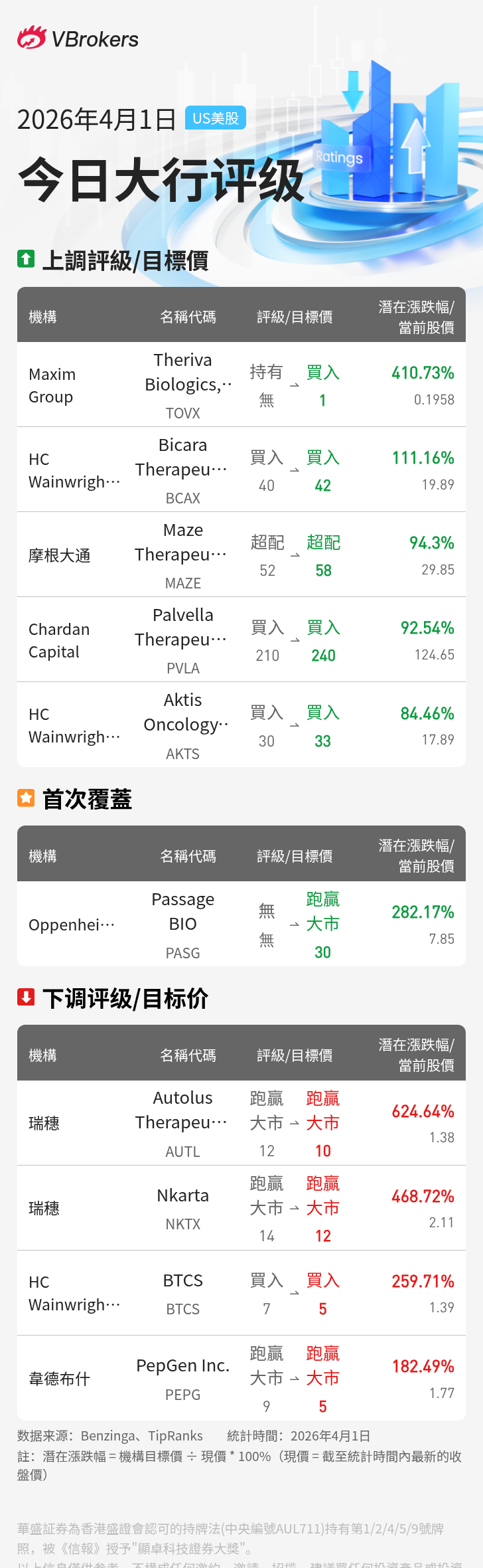 | Oppenheimer | Passage BIO | PASG | $7.85 | 首予 | $30.0 | 282.17% |